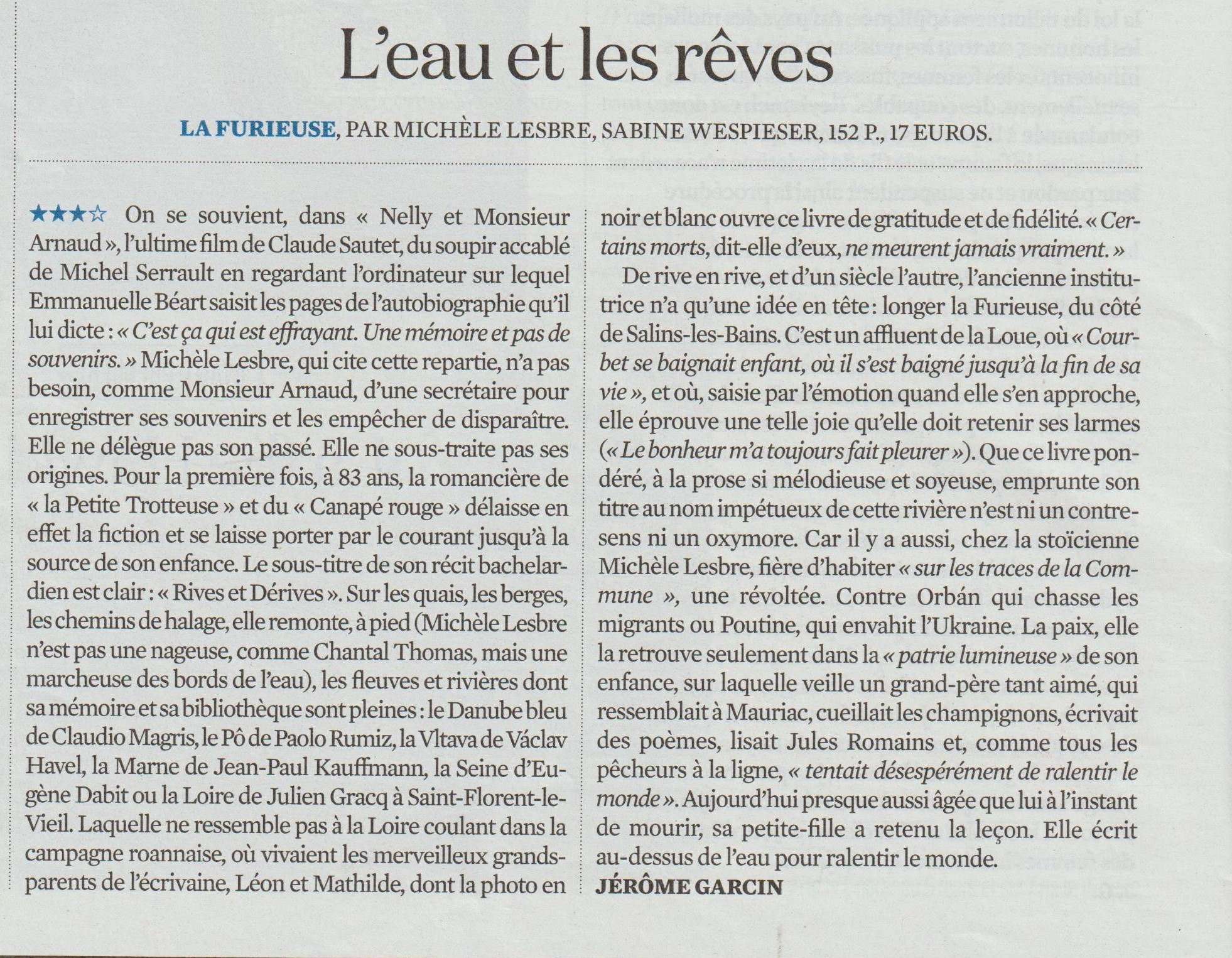 « Rives et dérives » est un parfait sous-titre pour ce nouveau texte de Michèle Lesbre. Elle y emprunte des chemins de traverse afin de rejoindre une rivière, la Furieuse, dont le nom – sans qu’elle la connaisse – a résonné en elle de manière particulière. « Rives et dérives » pourrait également caractériser son beau parcours d’écriture, où petit à petit elle a délaissé la forme romanesque pour vagabonder dans une prose plus libre, plus voyageuse et rêveuse. Ce récit clairement autobiographique se lit comme un art poétique de l’écrivaine.