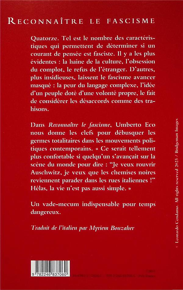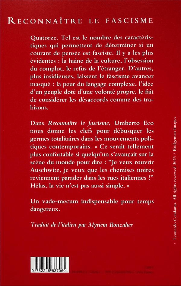 Lecture nécessaire par ces temps qui courent ! Dès la page 44, quatorze points sont clairement énumérés et expliqués qui permettent de débusquer si un courant de pensée est fasciste. Même en l’absence de mouvement fasciste, voici la liste simplifiée, dressée par Umberto ECO :